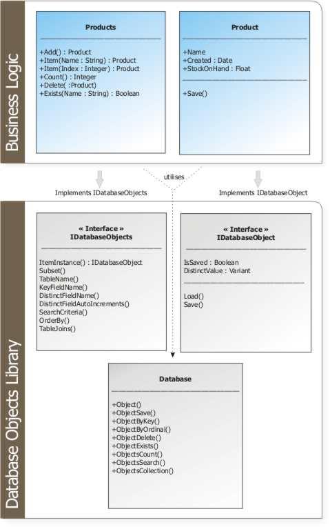 Implementing a database table using classes and the DatabaseObjects library involves creating two classes. The first class, represents a database table, while the second class represent each database record in the table. For the classes to "hook into" the library the first class (or collection class) must implement the IDatabaseObjects interface while the second class must implement the IDatabaseObject interface. By implementing each of the IDatabaseObjects' and IDatabaseObject functions the collection class can specify which table it is tied to, the table's unique field, whether it should only represent a subset of the table, how the table should be sorted, if there are any related tables, etc. while the second class can specify how a database record is to be copied to and from the class. With the interfaces implemented the DatabaseObjects library can then automatically generate the appropriate SQL statements for common database functions such as inserting a new record, updating an existing record, searching through a table, enumerating through a set of records, returning the number of records in a table, etc.